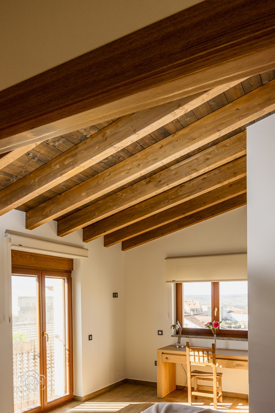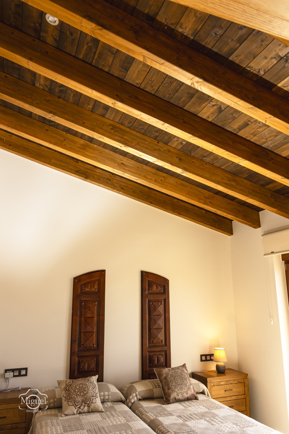 Dispone de dos amplias habitaciones, ambas con cuarto de baño privado, y con techos altos que sorprenden por su espectacular artesonado de madera, aportando carácter y calidez a cada estancia. El salón-cocina, muy espacioso y luminoso, está decorado con mimo y equipado con mobiliario de calidad, pensado para disfrutar sin prisas.
